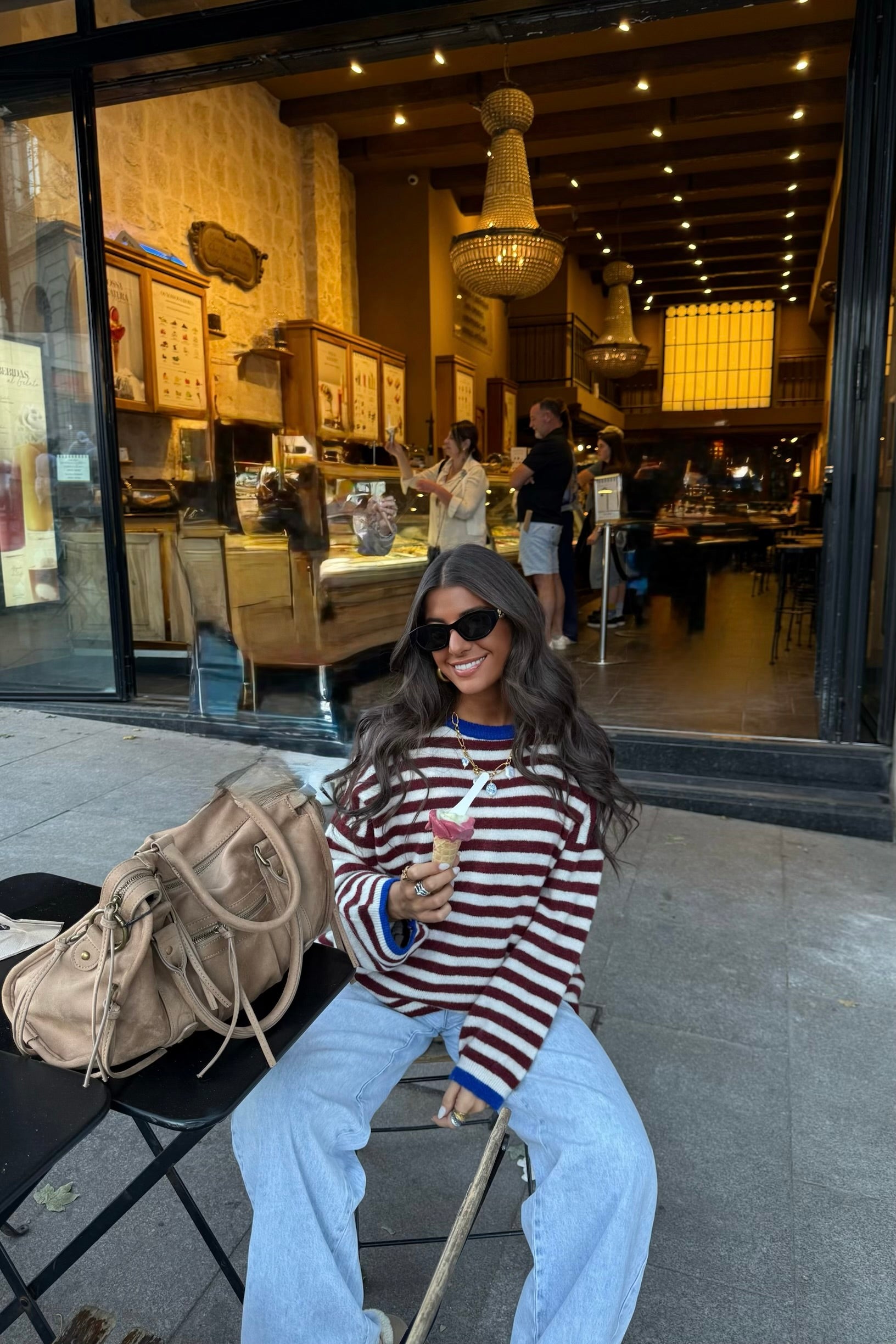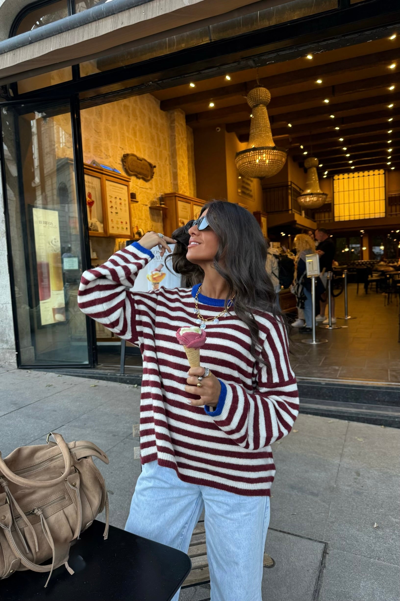 Burgundy & White Striped Mohair Sweater with Blue Details