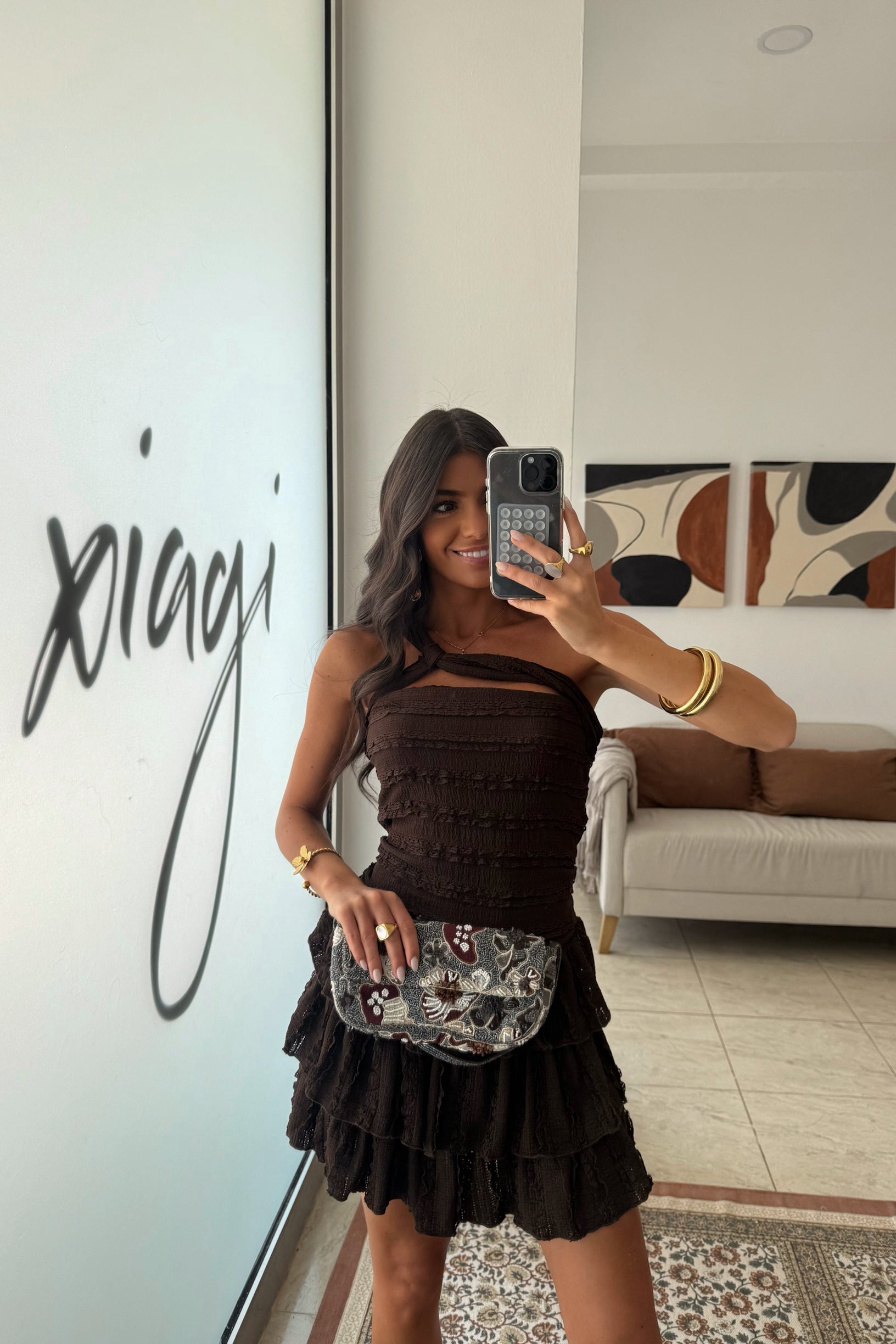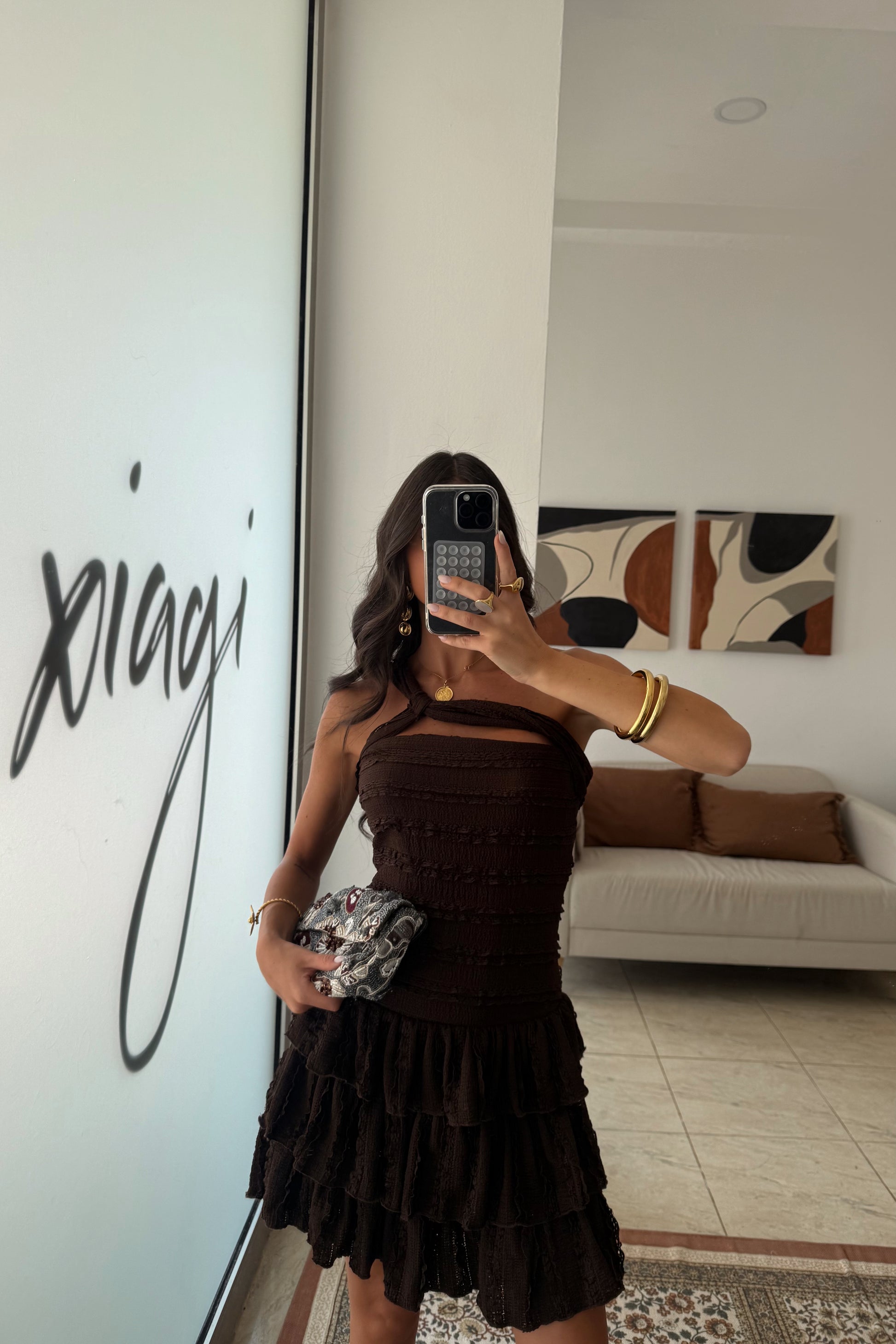 Brown mini dress with a smocked bodice, adjustable straps that can be styled multiple ways, and layered ruffle skirt. One size fits XS to M/L.
