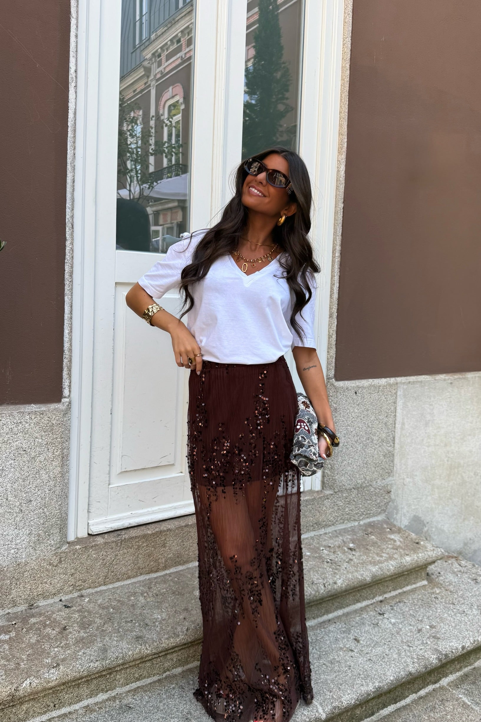 Sheer maxi skirt in a deep espresso tone, embellished with shimmering sequins for effortless elegance.