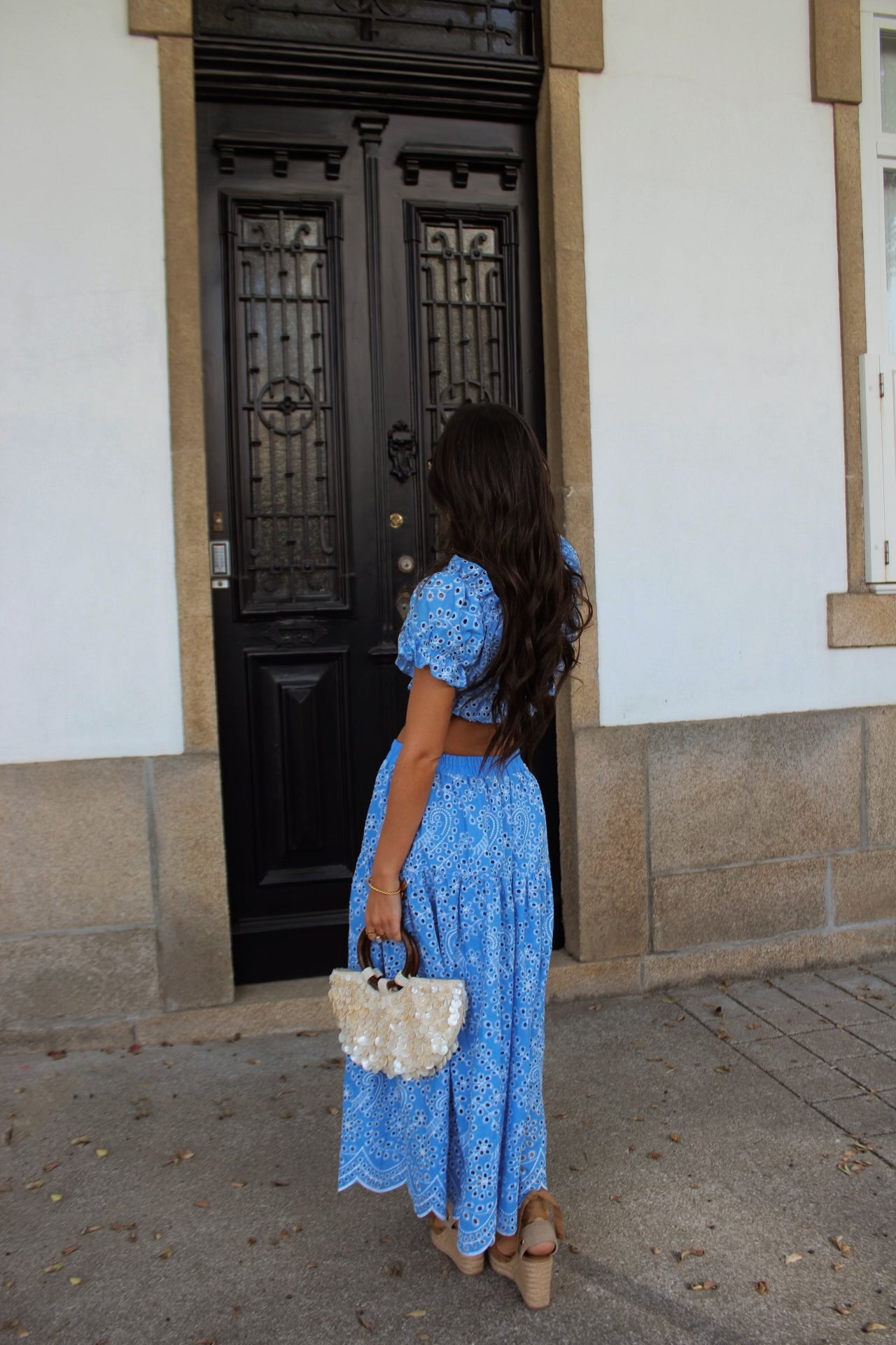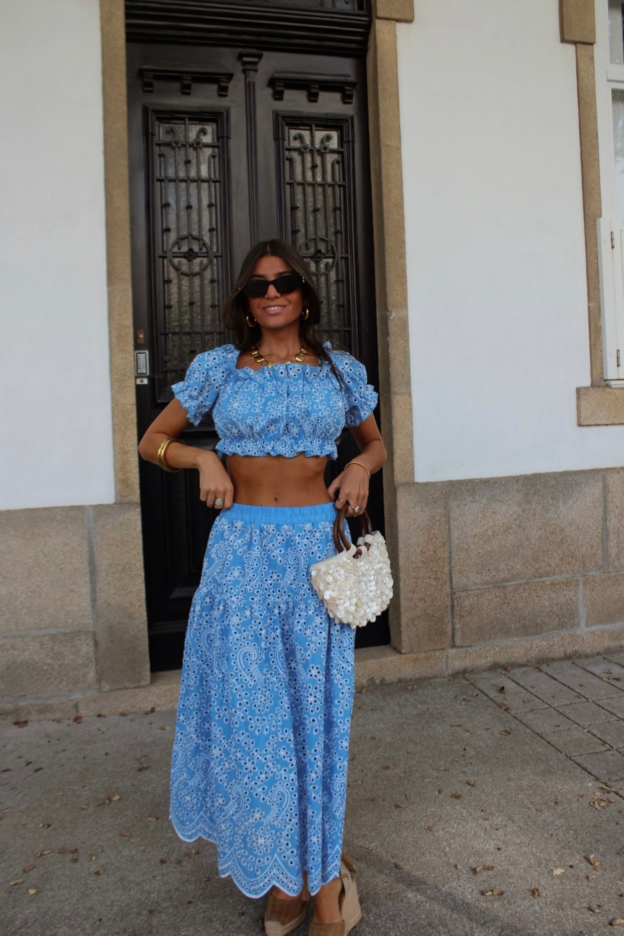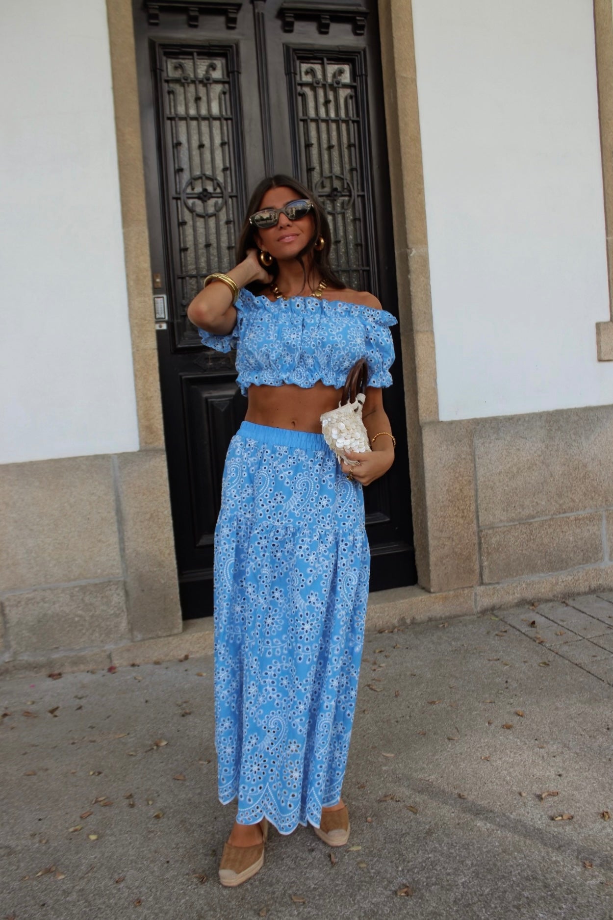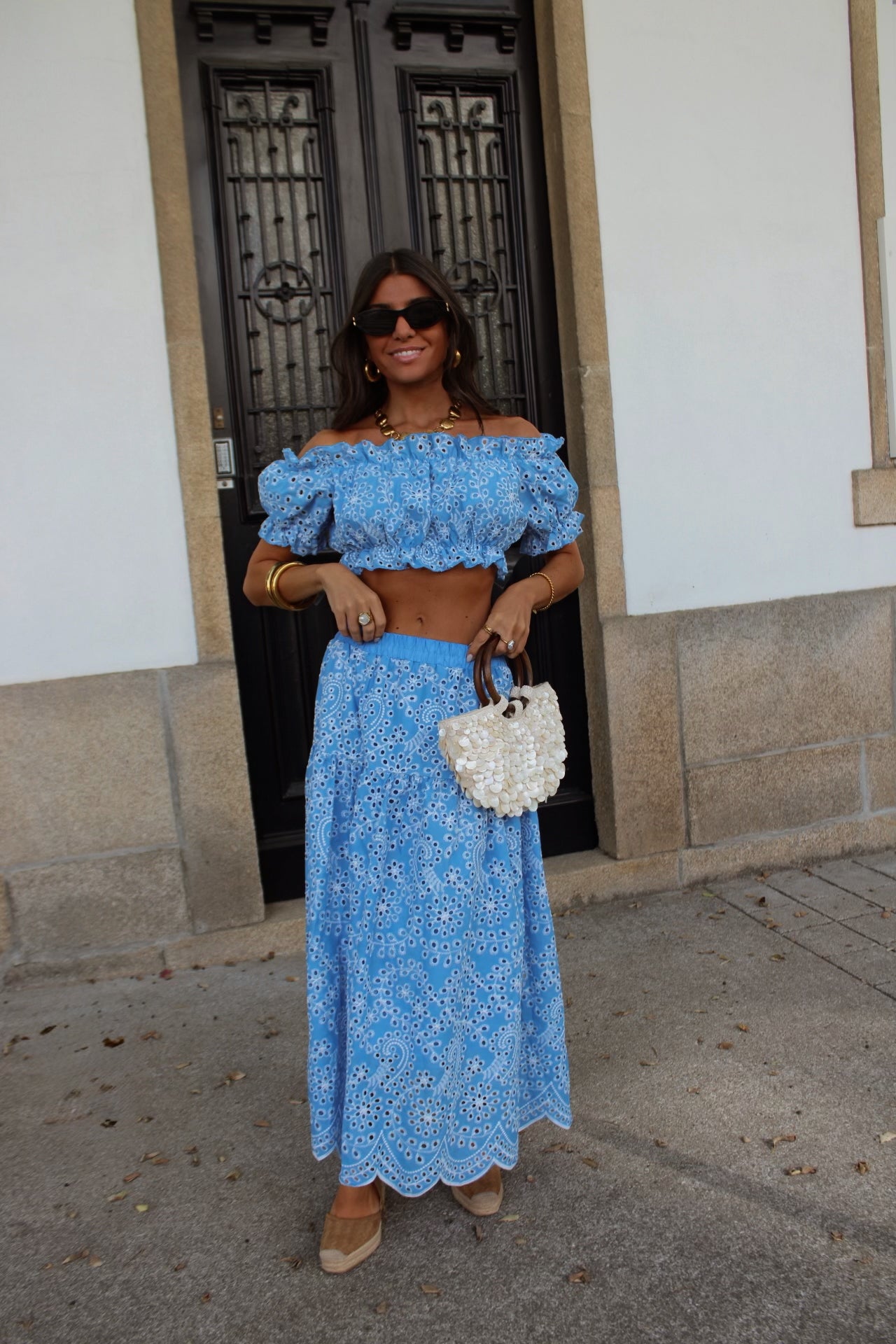 Off-shoulder crop top with elastic detail and matching embroidered maxi skirt. One size: fits from XS to M/L.